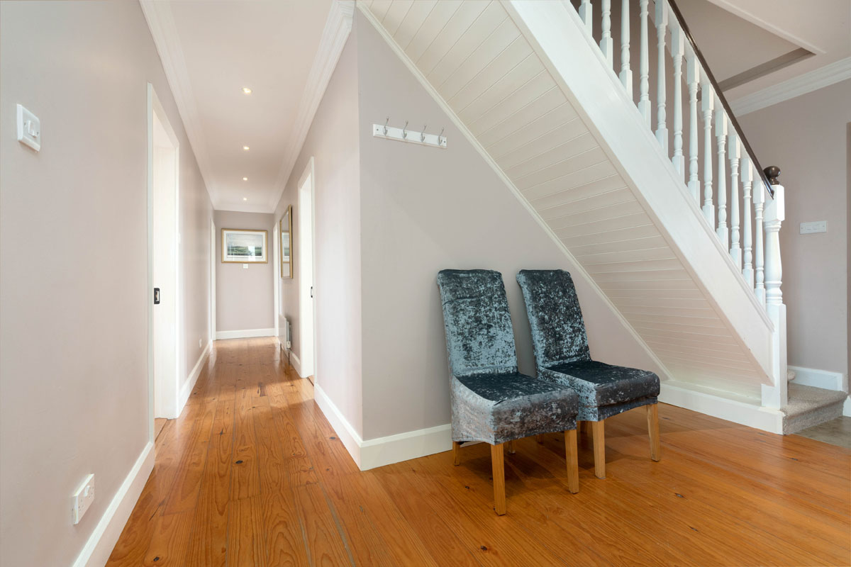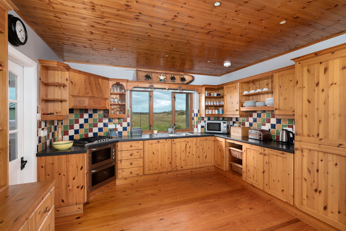 5 Bedrooms – Sleeps 9. All accommodation is on the ground floor. The accommodation includes entrance hall, 5 bedrooms, 5 bathrooms, open plan kitchen, dining, living room, and a utility room. The kitchen is very well equipped with all necessary equipment including dishwasher, coffee maker, microwave, fridge-freezer, kettle, toaster. The dining area is bright and airy and offers large table and chairs, large windows, and sea views. The living room area is furnished with large comfortable sofas and chairs, a wood burning stove, and flat screen multi-channel TV. The utility room houses the washer and dryer and additional storage. The open plan kitchen, living and dining areas have timber flooring. All bedrooms are carpeted, and all bathrooms are tiled.