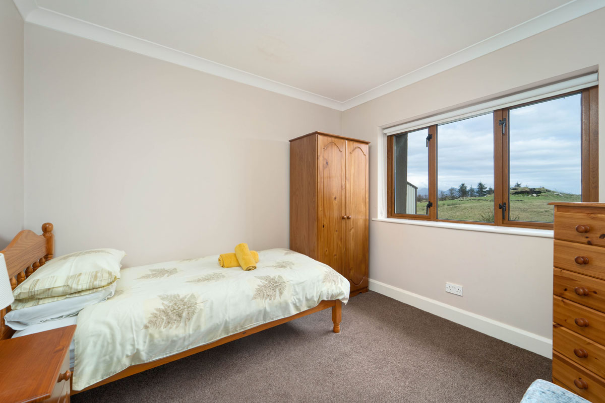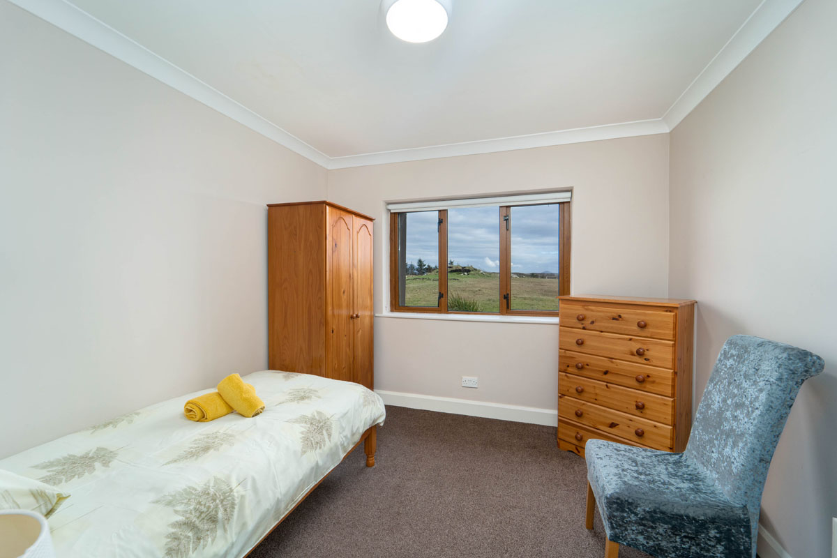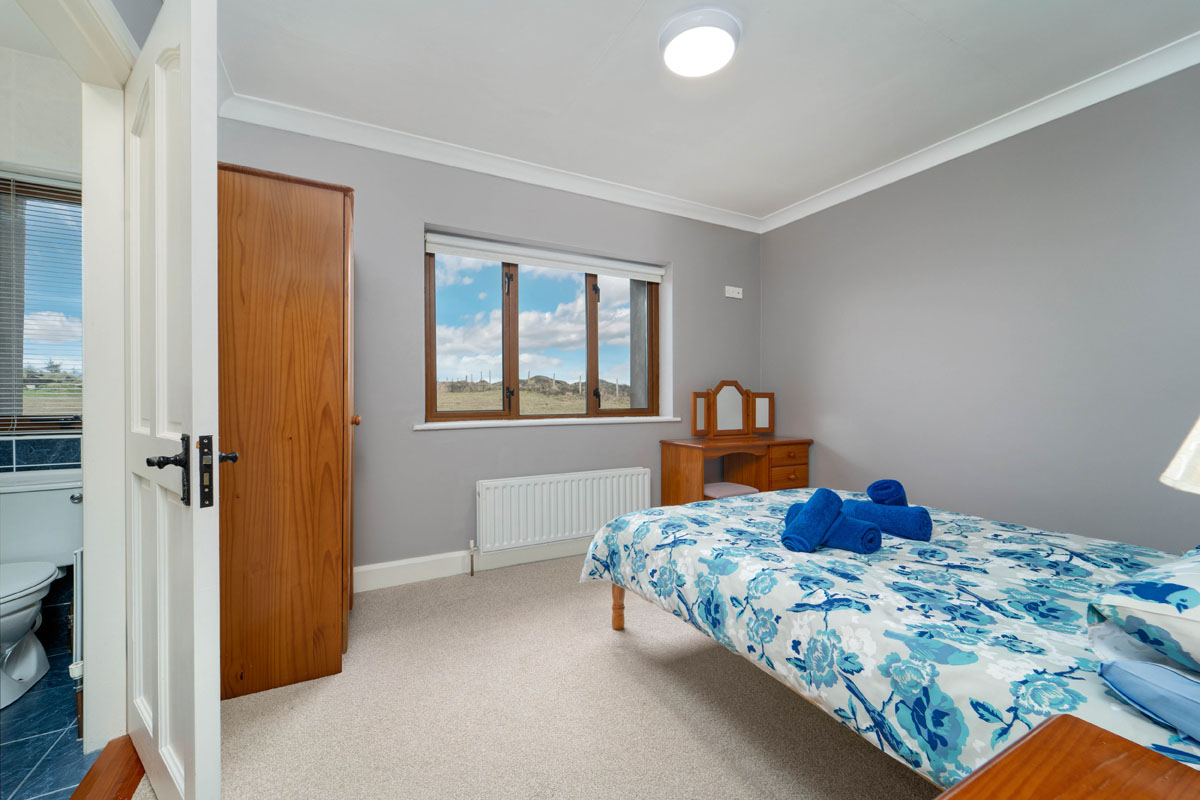 Bedroom 3 faces onto the front of the property, offering sea views, a double bed, wardrobe and drawers, and en-suite bathroom with electric shower.