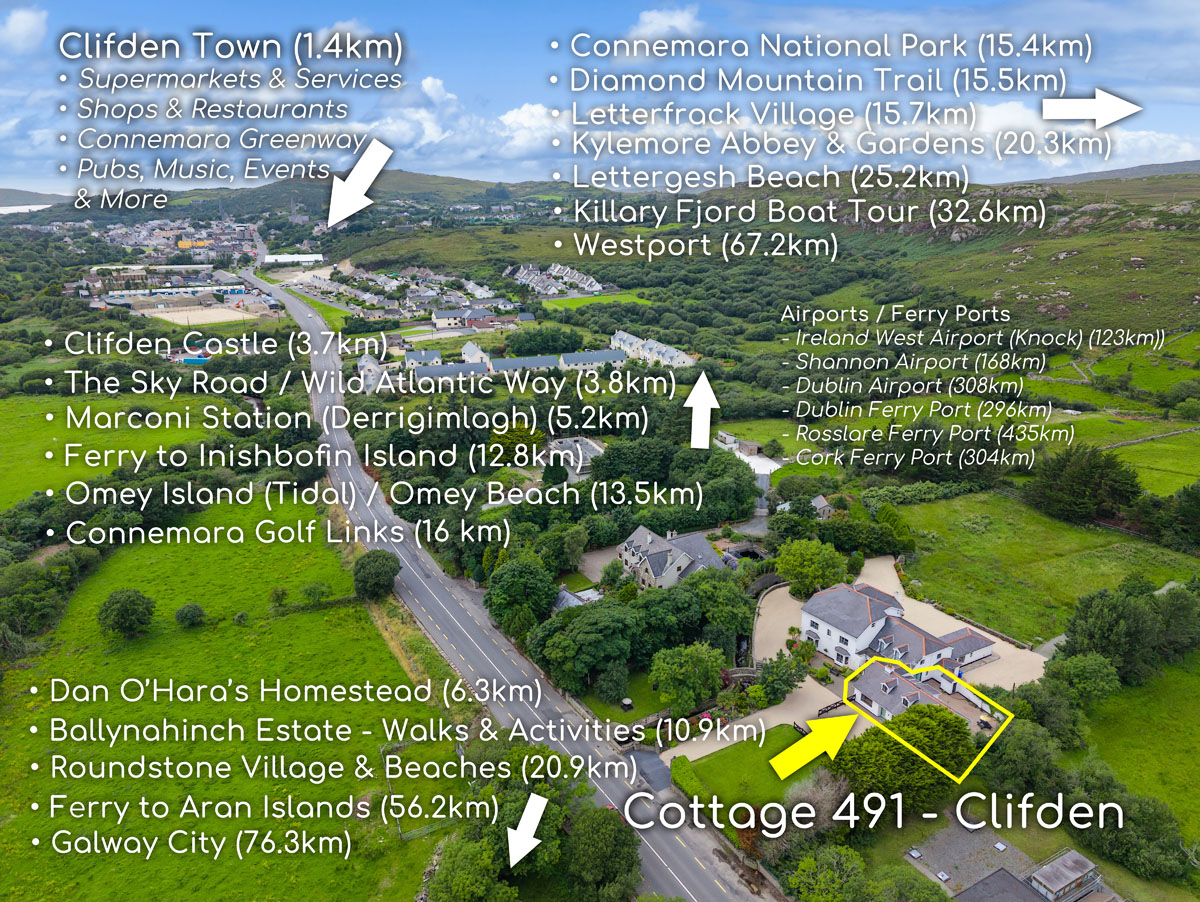 A spacious luxurious 4-bedroom semi-detached cottage located on a landscaped site alongside a larger rental property, with landscaped mature gardens, ample parking, and the benefit of being a short stroll from Clifden town. Just a 5–10-minute walk from local shops, bars and restaurants, this property is ideal for families or a group of friends. This cottage is ideal for families and friends to share and is also ideal for larger groups that may require additional accommodation. Clifden is a bustling market town boasting ample shops, bars, and restaurants, and will provide you with everything you might need for your self-catering holiday. Traditional music, song and dance are very popular in many of the local pubs. This is an ideal base for exploring the Connemara region. Walk or cycle the Sky Road for elevated views of the Atlantic shoreline or stop off and see the ruins of Clifden castle. Enjoy some fishing along the rugged coastline nearby. Just a short drive away, you will find Omey Beach, Connemara National Park at Letterfrack, Kylemore Abbey, Killary Fjord, and many more well-known areas of unique beauty. Connemara Golf Links at Ballyconneely is within easy reach, and promises an enjoyable game of golf, surrounded by unrivalled scenery. The ferry to Inishbofin Island can be found at Cleggan, an ideal day trip. Local activities include kayaking, coasteering, mountain walking, fishing, pony trekking, walking, cycling and much more.