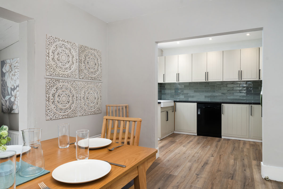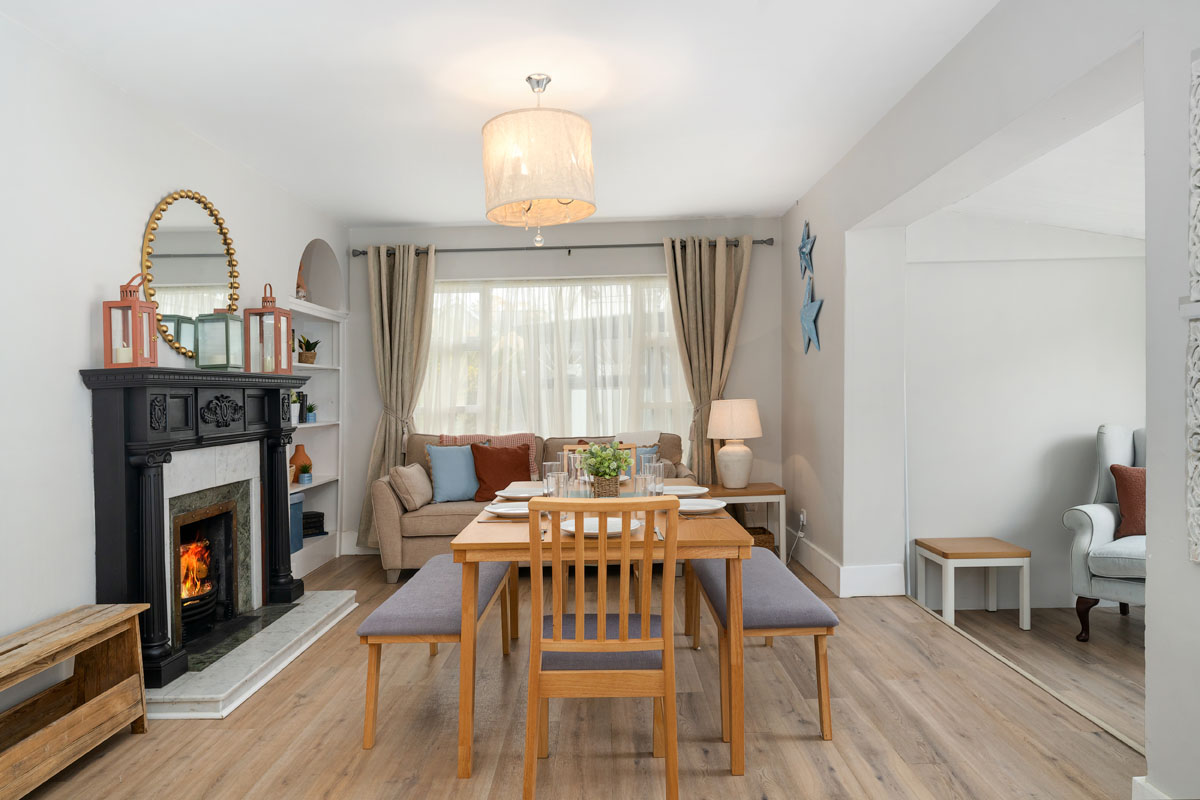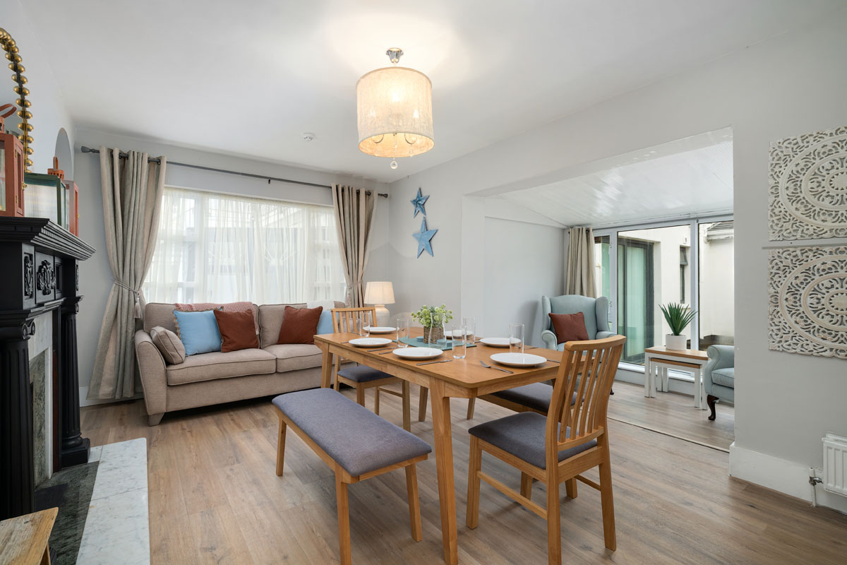 Parking and entry to the property is at the front of the house, into a bright and airy hallway. The living room is to the front of the property and is flooded with natural light, furnished with comfortable furniture, open fireplace and large flatscreen TV, making it the ideal room to sit and relax. The spacious combined kitchen and dining room/living room is to the rear of the property is the perfect space for families and groups of friends to share. The kitchen is fully equipped with everything you need for a comfortable self-catering stay. It includes a dishwasher, 4 ring cooker with oven, microwave, electric kettle, toaster, and ample tableware and cookware. The adjoining utility area has a washing machine, and a tumble dryer. Whilst further down the hall is a home office/workspace with adjoining small sitting room with couch, an ideal space for reading and relaxing.