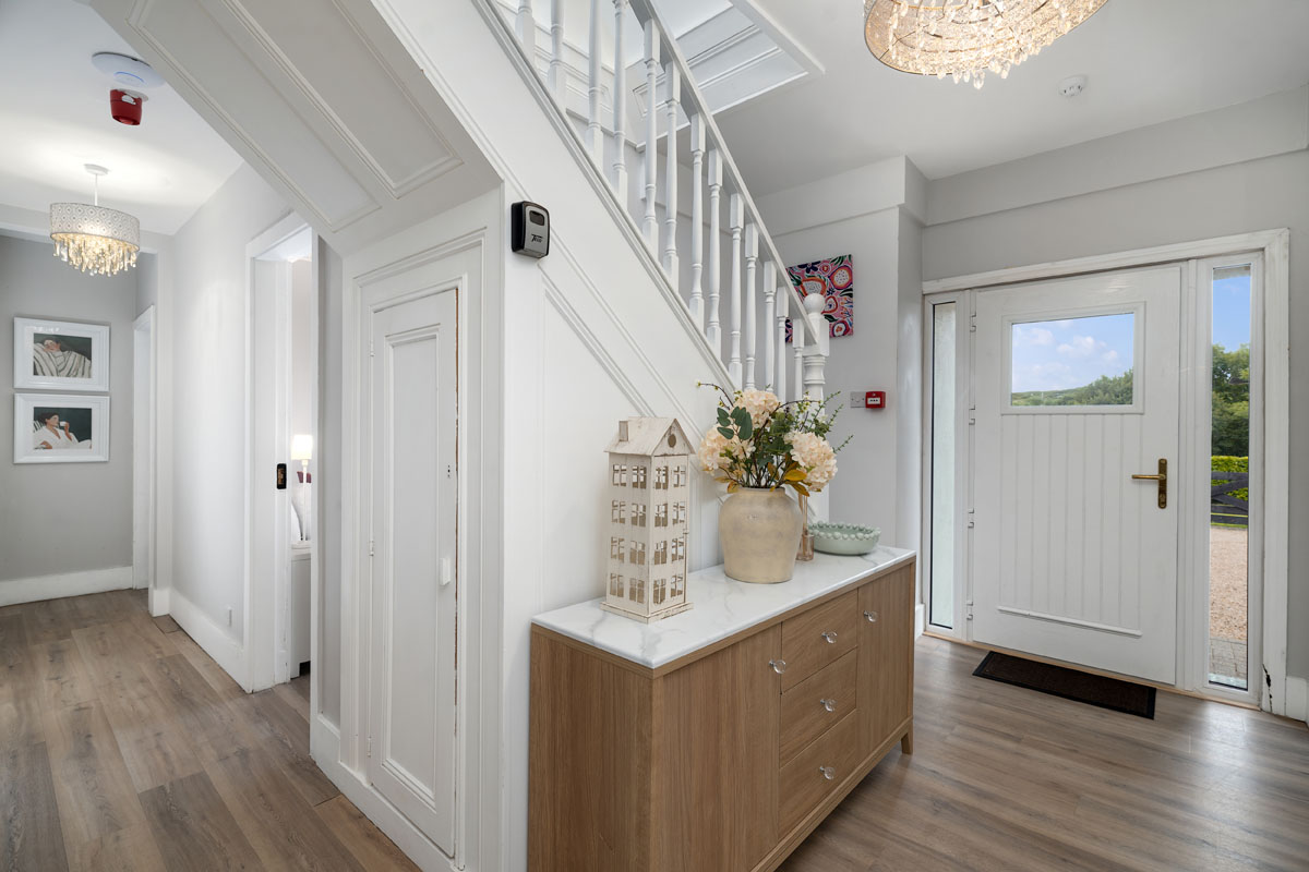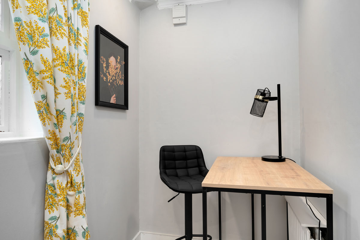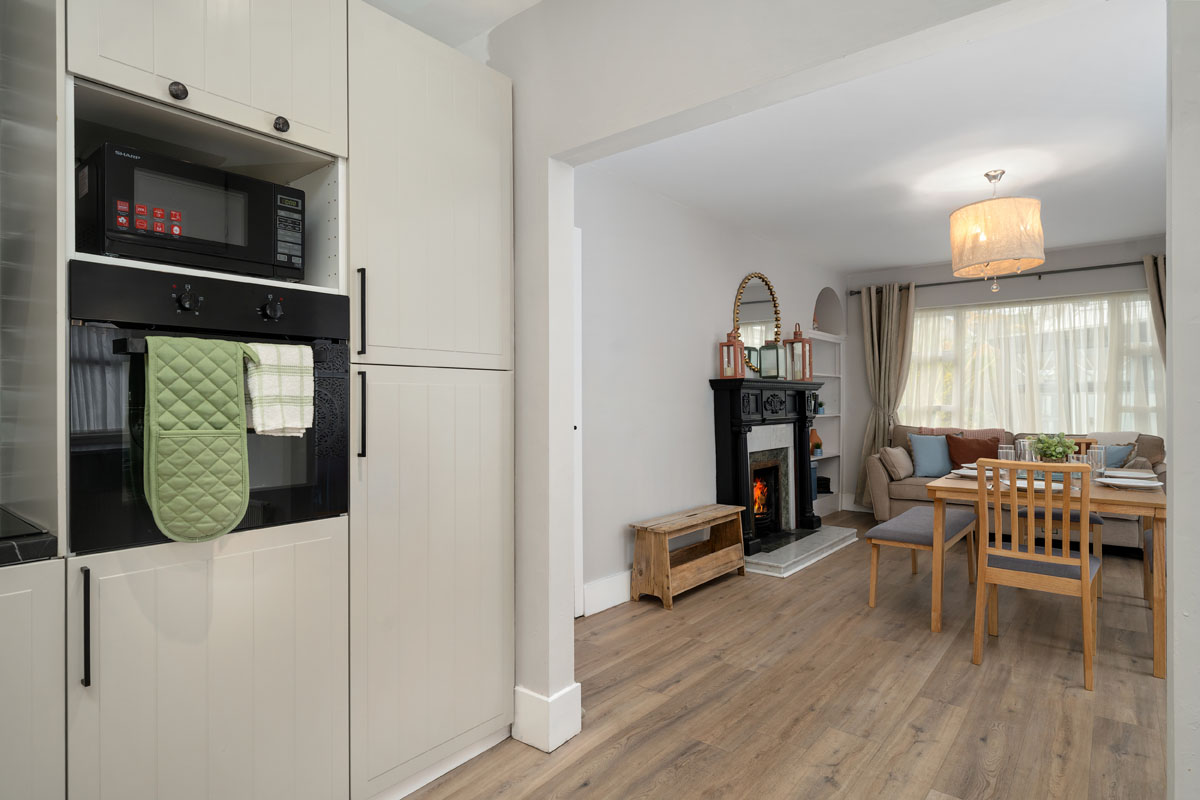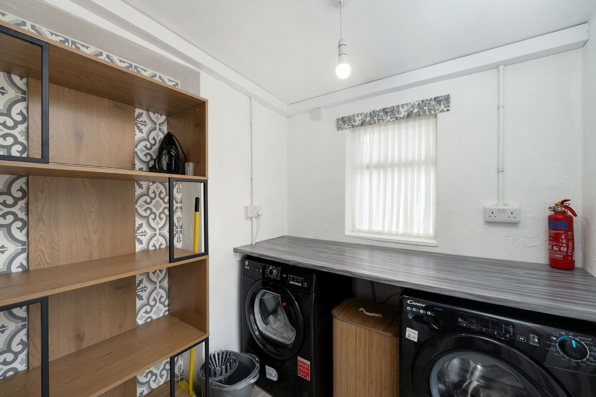 Parking and entry to the property is at the front of the house, into a bright and airy hallway. The living room is to the front of the property and is flooded with natural light, furnished with comfortable furniture, open fireplace and large flatscreen TV, making it the ideal room to sit and relax. The spacious combined kitchen and dining room/living room is to the rear of the property is the perfect space for families and groups of friends to share. The kitchen is fully equipped with everything you need for a comfortable self-catering stay. It includes a dishwasher, 4 ring cooker with oven, microwave, electric kettle, toaster, and ample tableware and cookware. The adjoining utility area has a washing machine, and a tumble dryer. Whilst further down the hall is a home office/workspace with adjoining small sitting room with couch, an ideal space for reading and relaxing.