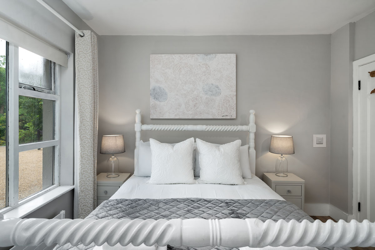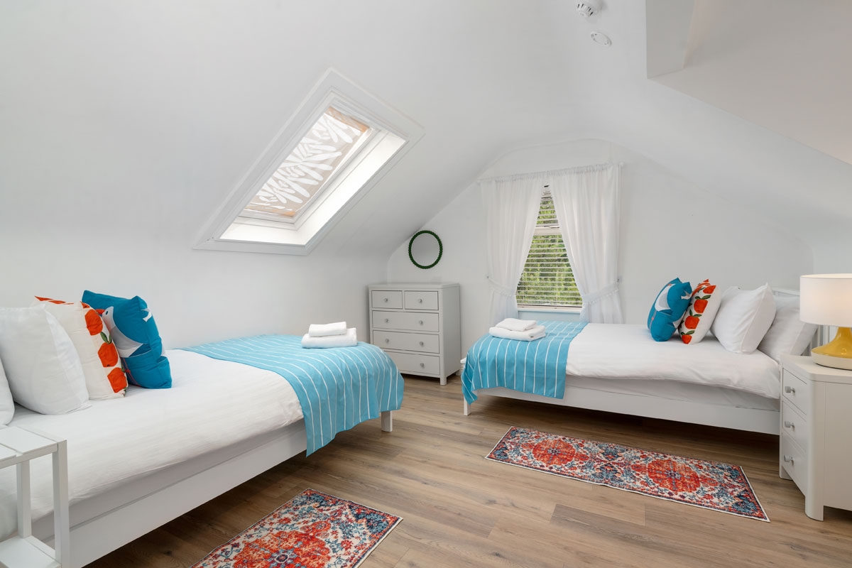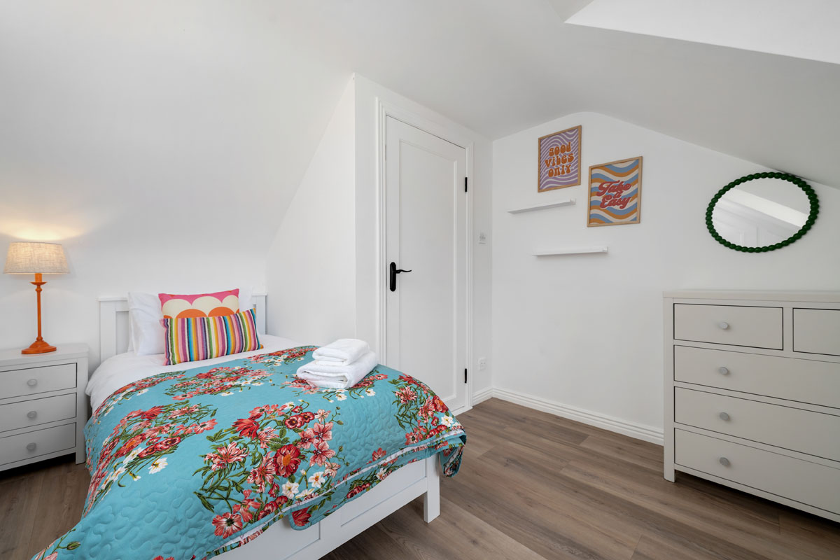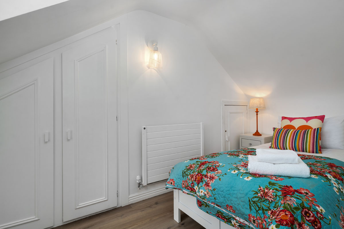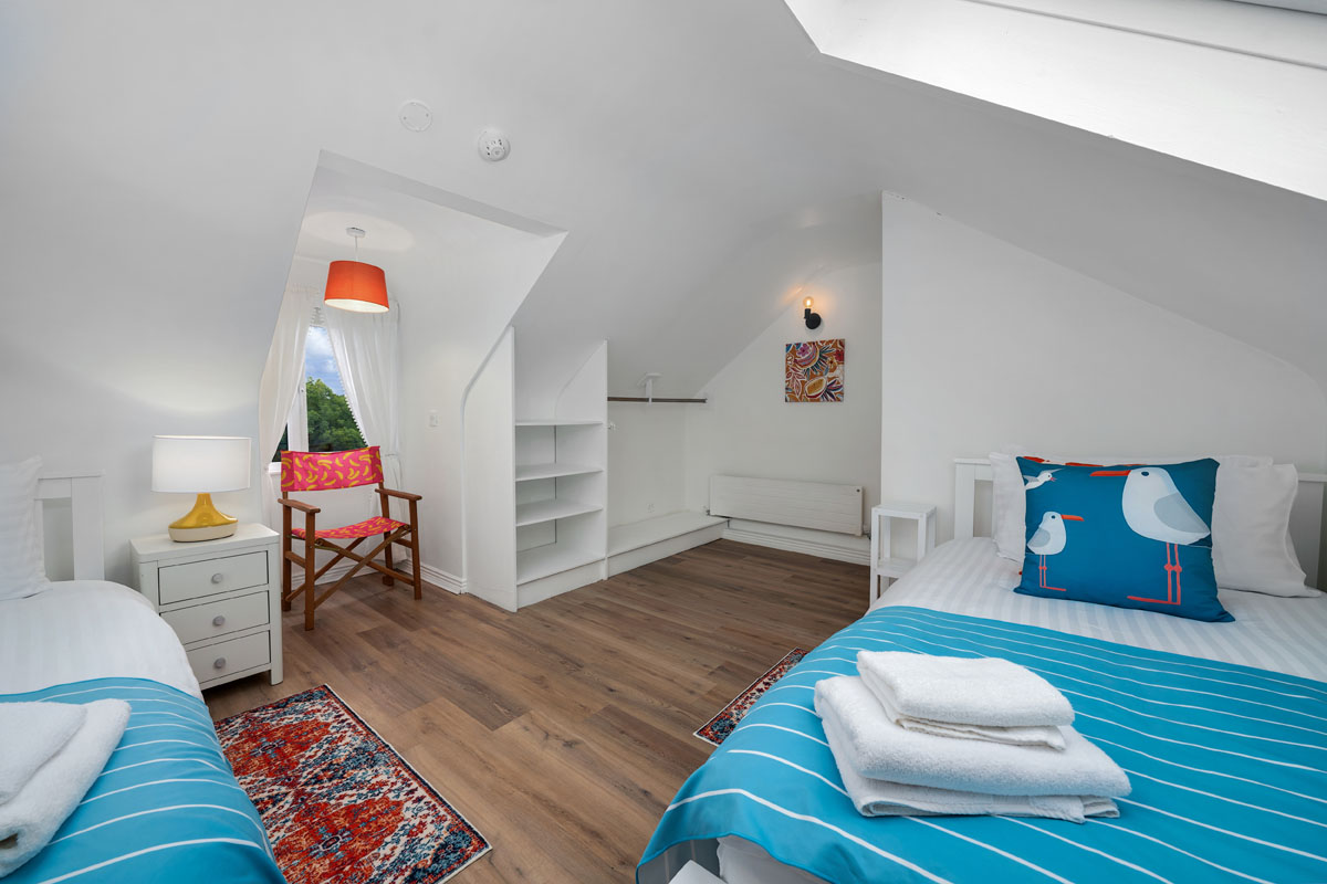 The property has four bedrooms in total, one king, one twin room, and two single rooms, sleeping 6 persons in total. The king-room and single are to the front of the property whereas the twin room and single room are on the first-floor dormer. All bedrooms have timber floors and ample storage for guests’ belongings. The main bathroom on the ground floor has WC, jack and jill sinks and large bathtub. The upstairs bathroom has WC, sink and shower.