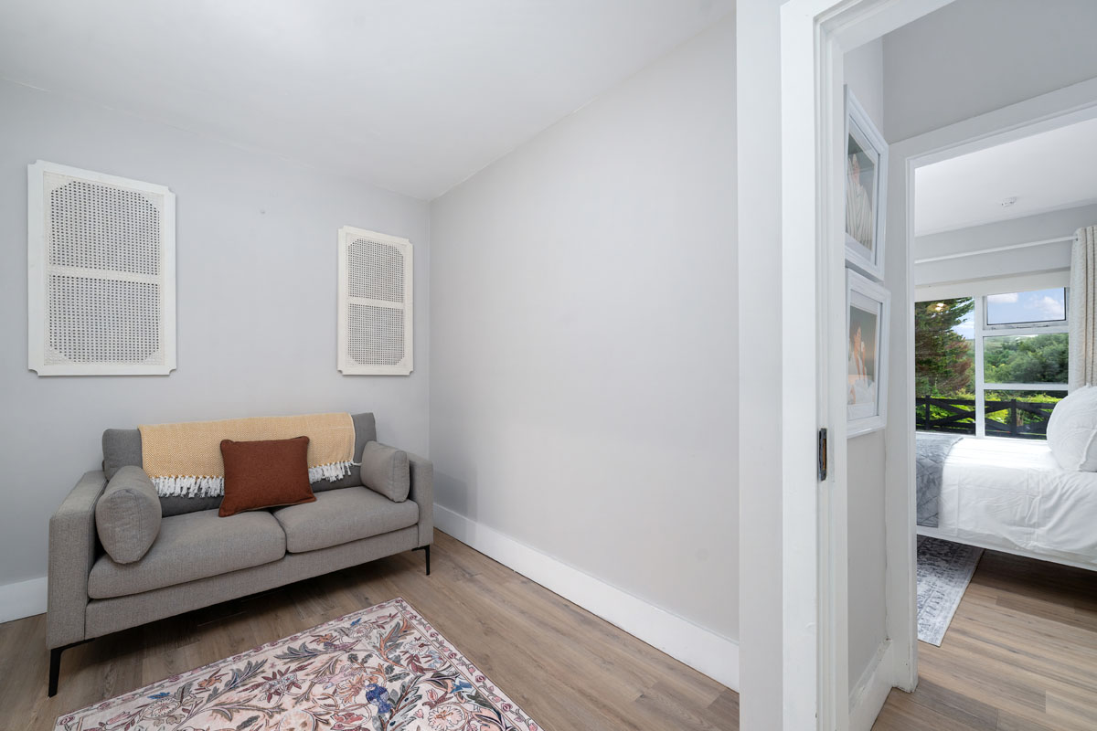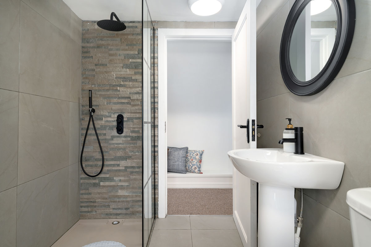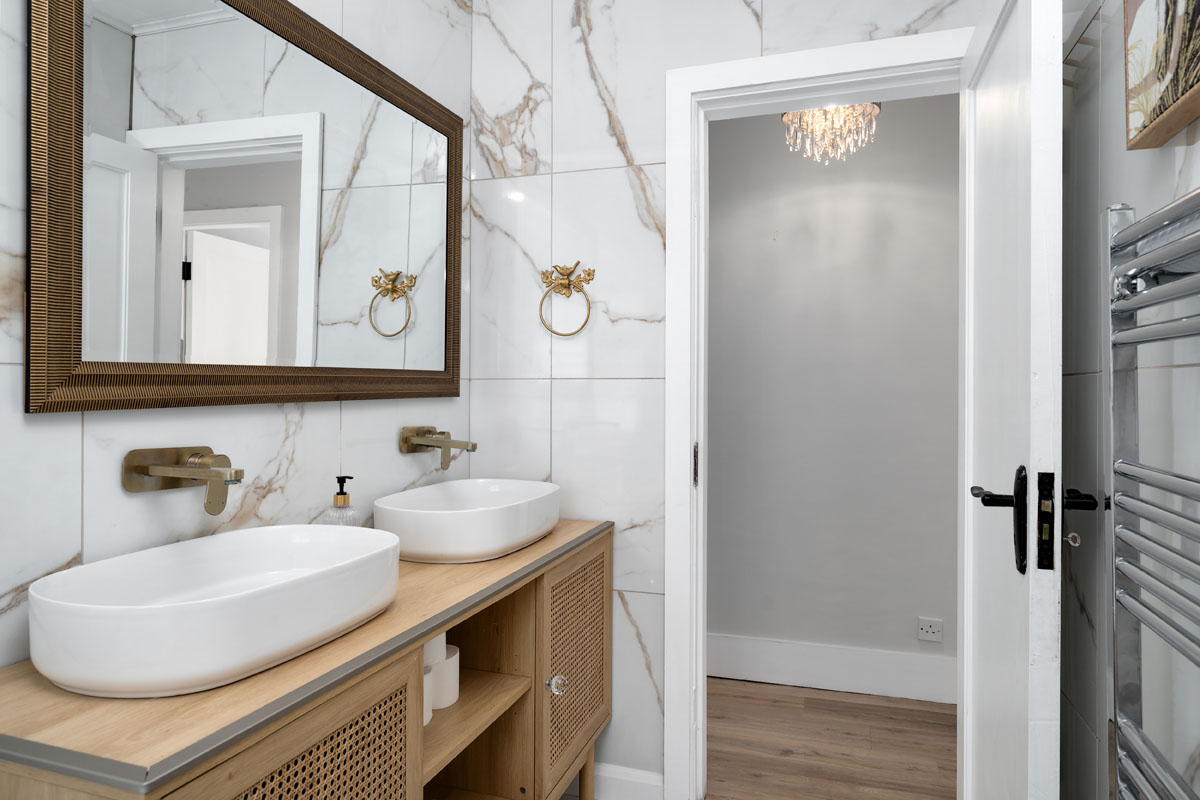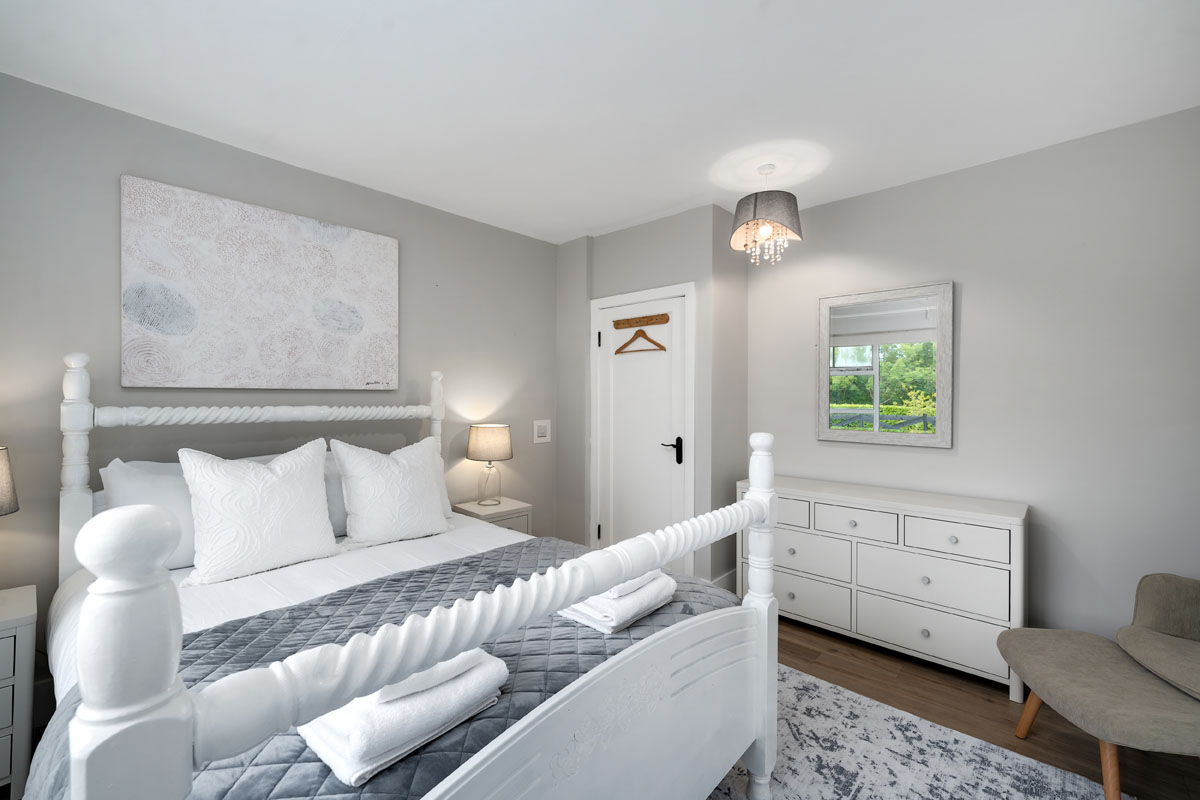 The property has four bedrooms in total, one king, one twin room, and two single rooms, sleeping 6 persons in total. The king-room and single are to the front of the property whereas the twin room and single room are on the first-floor dormer. All bedrooms have timber floors and ample storage for guests’ belongings. The main bathroom on the ground floor has WC, jack and jill sinks and large bathtub. The upstairs bathroom has WC, sink and shower.