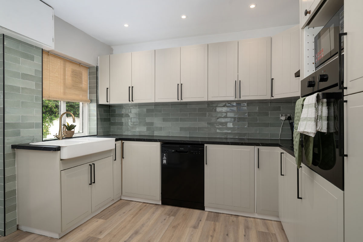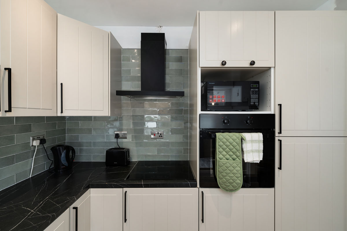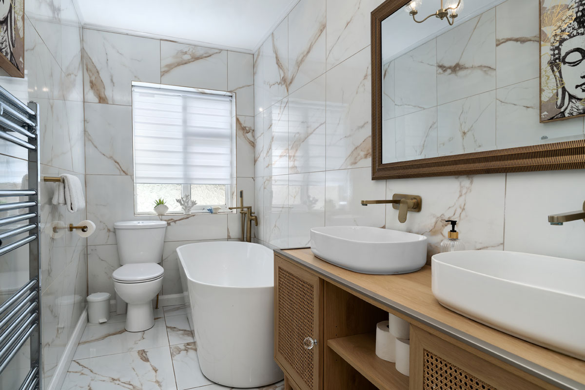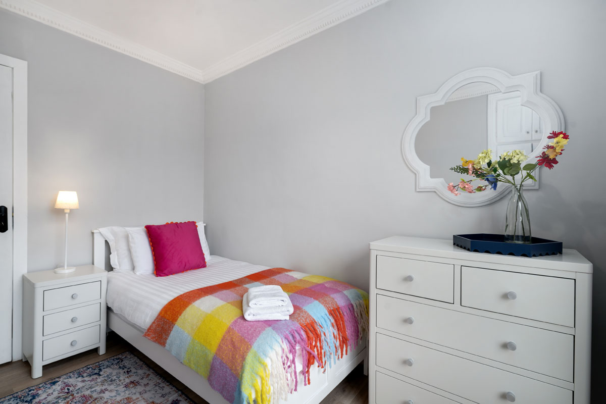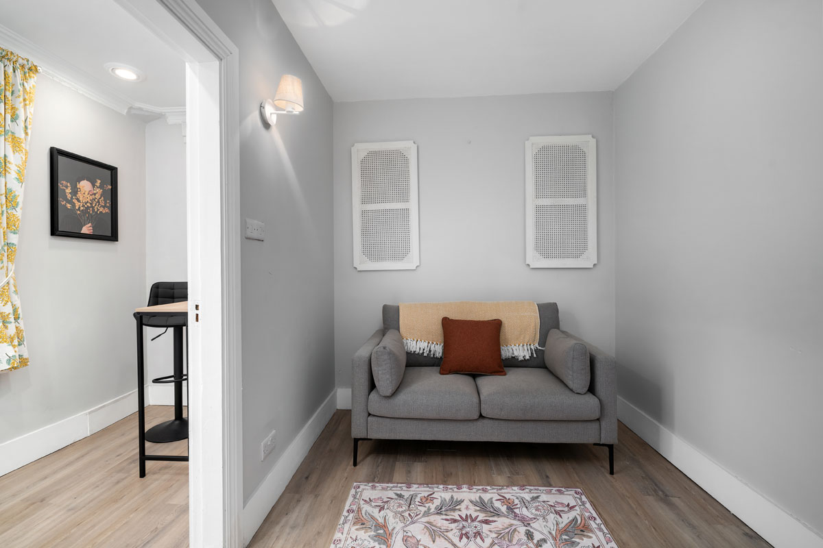 The property has four bedrooms in total, one king, one twin room, and two single rooms, sleeping 6 persons in total. The king-room and single are to the front of the property whereas the twin room and single room are on the first-floor dormer. All bedrooms have timber floors and ample storage for guests’ belongings. The main bathroom on the ground floor has WC, jack and jill sinks and large bathtub. The upstairs bathroom has WC, sink and shower.