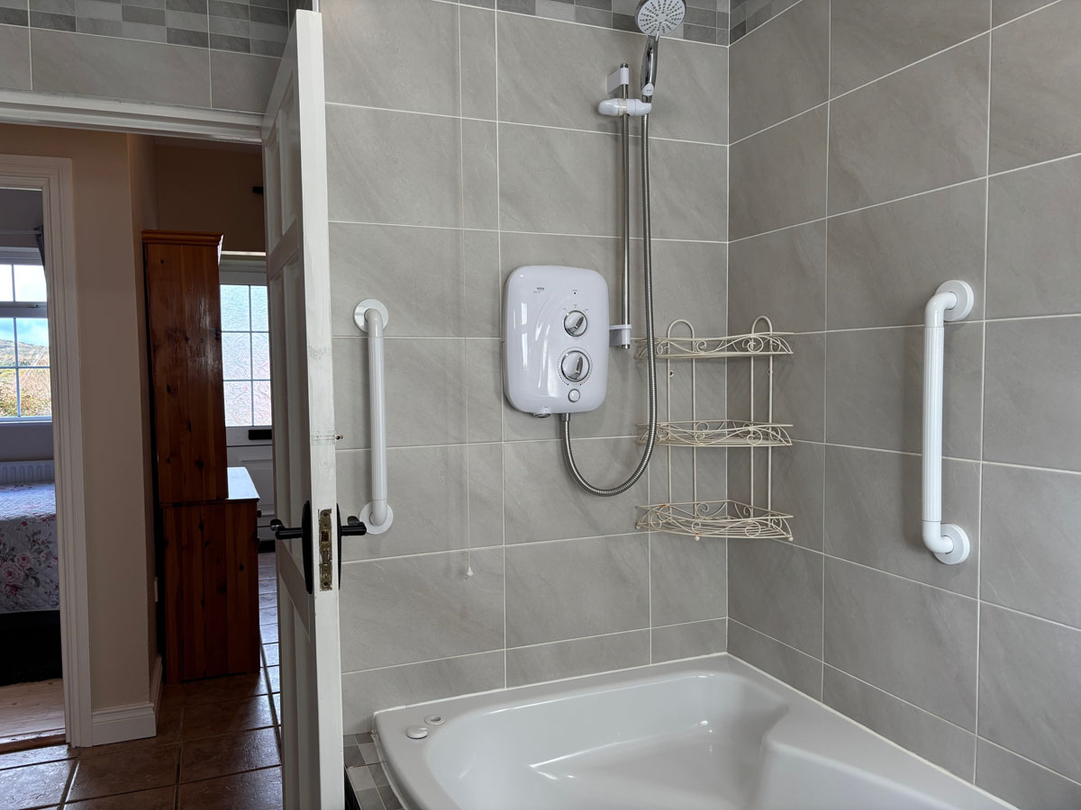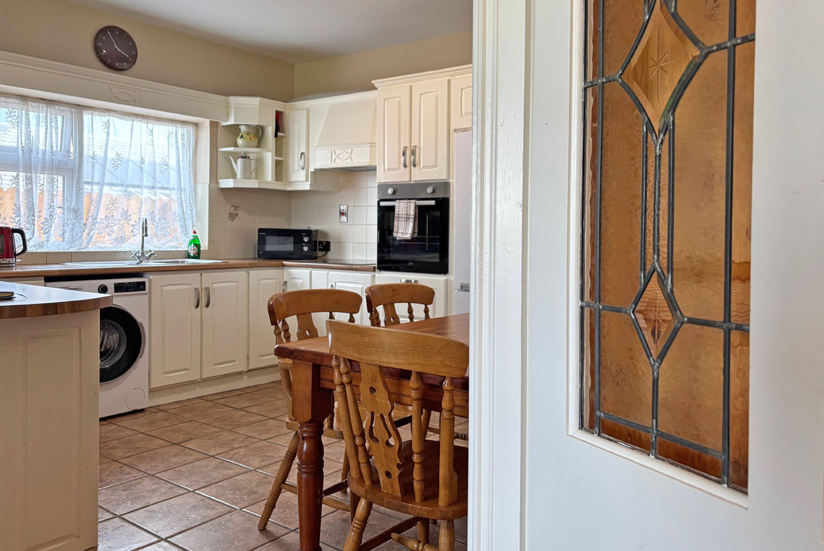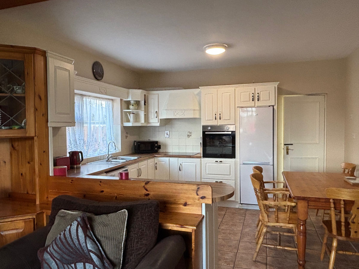 The welcoming hall leads into a light and cosy combined living space, including a dining area with table and ample dining seating for six people, and a sitting area with a large couch, armchair, and a large flat screen TV. This space is flooded with natural light and offers views on to the front of the property. The adjacent country cottage style kitchen is well equipped with a fridge freezer, microwave, kettle, toaster, electric cooker, electric hob and washing machine.